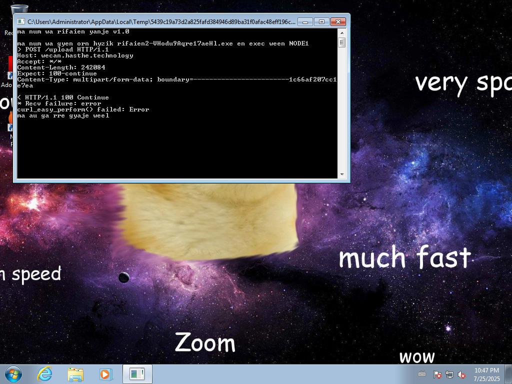 2025-07-25 22:47:47,000 [analyzer] DEBUG: Starting analyzer from: C:\tmpdrdvpd 2025-07-25 22:47:47,015 [analyzer] DEBUG: Pipe server name: \??\PIPE\GkiLcOKeNiaDNTWUzJCGqxwj 2025-07-25 22:47:47,015 [analyzer] DEBUG: Log pipe server name: \??\PIPE\RkOGTrVNKxpIohZTkV 2025-07-25 22:47:47,312 [analyzer] DEBUG: Started auxiliary module Curtain 2025-07-25 22:47:47,312 [analyzer] DEBUG: Started auxiliary module DbgView 2025-07-25 22:47:47,858 [analyzer] DEBUG: Started auxiliary module Disguise 2025-07-25 22:47:48,062 [analyzer] DEBUG: Loaded monitor into process with pid 508 2025-07-25 22:47:48,062 [analyzer] DEBUG: Started auxiliary module DumpTLSMasterSecrets 2025-07-25 22:47:48,062 [analyzer] DEBUG: Started auxiliary module Human 2025-07-25 22:47:48,062 [analyzer] DEBUG: Started auxiliary module InstallCertificate 2025-07-25 22:47:48,062 [analyzer] DEBUG: Started auxiliary module Reboot 2025-07-25 22:47:48,108 [analyzer] DEBUG: Started auxiliary module RecentFiles 2025-07-25 22:47:48,108 [analyzer] DEBUG: Started auxiliary module Screenshots 2025-07-25 22:47:48,108 [analyzer] DEBUG: Started auxiliary module Sysmon 2025-07-25 22:47:48,108 [analyzer] DEBUG: Started auxiliary module LoadZer0m0n 2025-07-25 22:47:48,233 [lib.api.process] INFO: Successfully executed process from path u'C:\\Users\\ADMINI~1\\AppData\\Local\\Temp\\5439c19a73d2a825fafd384946d89ba31f0afac48eff196c0d6a3f496e8f2261.exe' with arguments '' and pid 1920 2025-07-25 22:47:48,483 [analyzer] DEBUG: Loaded monitor into process with pid 1920 2025-07-25 22:47:48,500 [analyzer] INFO: Added new file to list with pid 1920 and path C:\Users\Administrator\AppData\Local\Temp\rifaien2-VHodu9Aqre17aeHl.exe 2025-07-25 22:48:17,250 [analyzer] INFO: Analysis timeout hit, terminating analysis. 2025-07-25 22:48:17,703 [analyzer] INFO: Terminating remaining processes before shutdown. 2025-07-25 22:48:17,703 [lib.api.process] INFO: Successfully terminated process with pid 1920. 2025-07-25 22:48:17,717 [analyzer] INFO: Analysis completed.